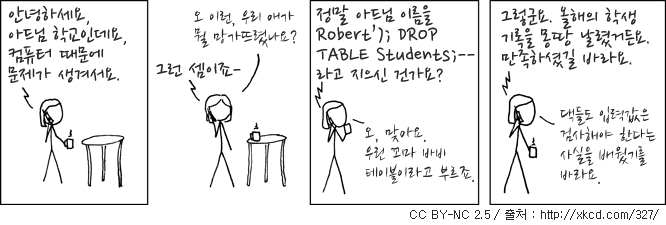 여기서 Robert'); DROP TABLE students;-- 을 '학생 이름' 자리에 넣을 경우 다음과 같은 명령문이 된다.