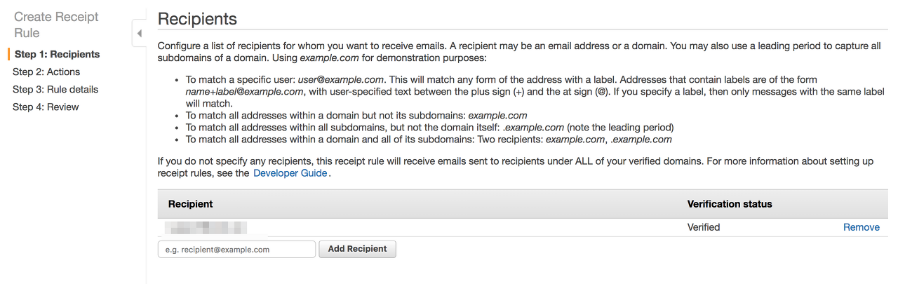 Recipients에서는 내가 포워딩시키고 싶은 이메일 주소를 적는다. ex) noreply@test.com 여기에 적은 이메일 주소로 메일이 오면 Lambda 코드에 적어둔 주소로 발송된다.
