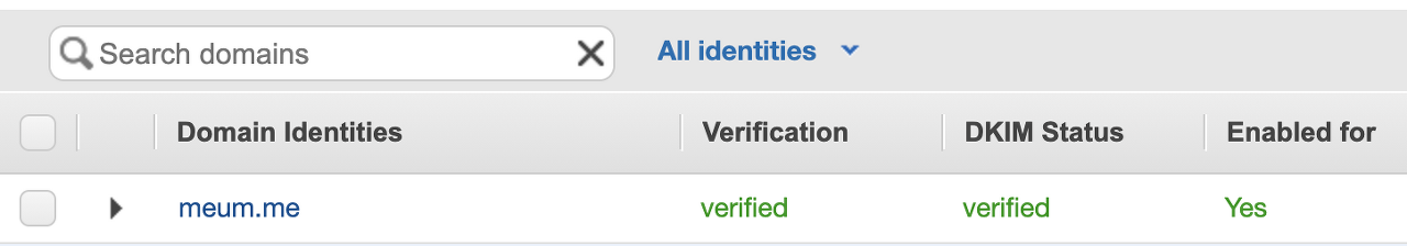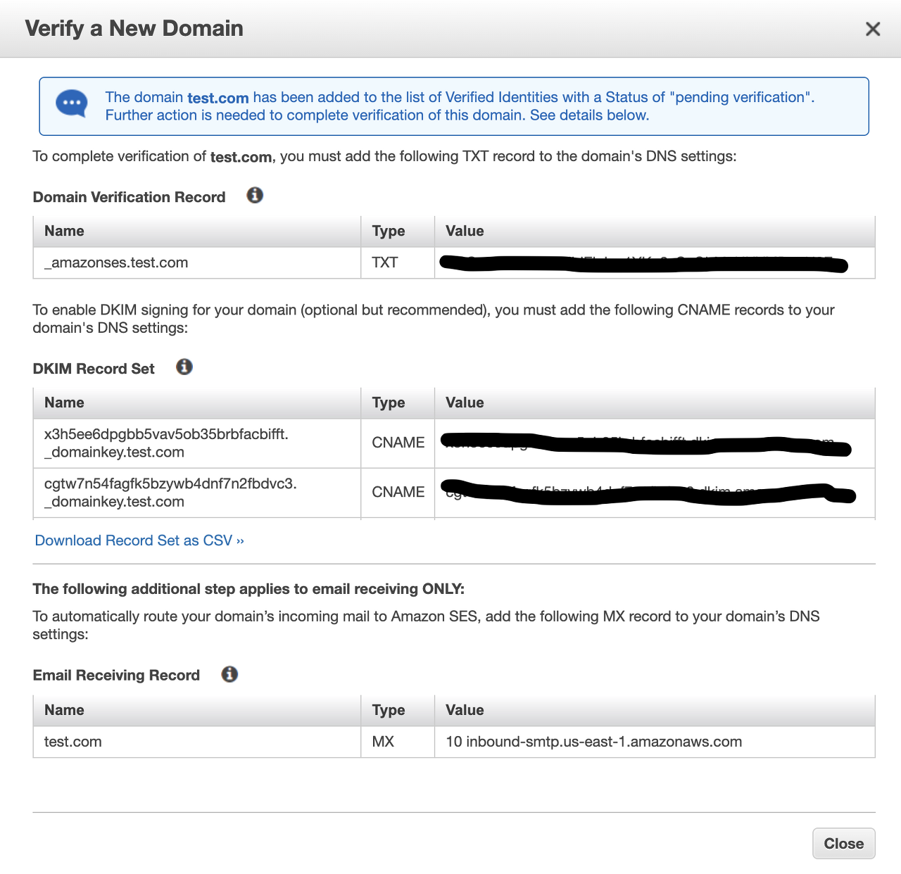 AWS Service에서 에서 Domains 탭에서 Verify a New Domain 을 한 뒤 도메인을 적어준다. 인증 시 꼭 Generate DKIM Settings 를 체크해준다. (DKIM을 설정해야 스팸메일로 분류되지 않을 확률이 높음) 그 뒤 알려주는 값들을 도메인 관리 사이트에서 추가해준다.