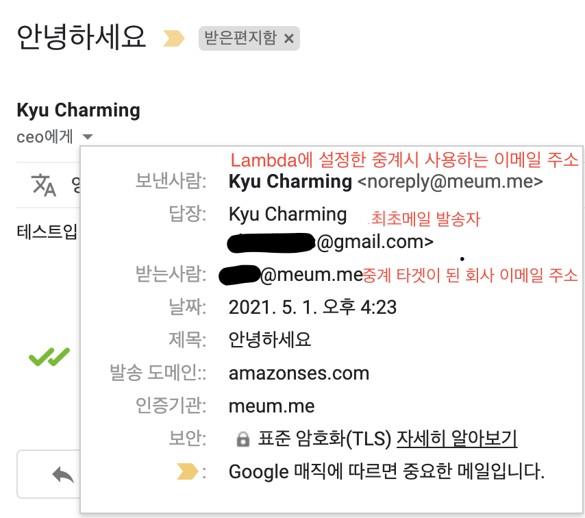 모든 설정이 끝난 다음, 다른 이메일에서 위에서 설정한 내 도메인을 사용하는 이메일 주소로 테스트 메일을 전송하면 중계가 정상적으로 이루어지는 것을 확인할 수 있다.