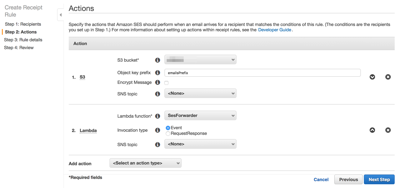 Rule 이름을 지어주고, Enable spam and virus scanning은 꼭 체크한다. 만약 SES에서 lambda:InvokeFunction 권한 추가를 요청하면, 허용한다. 만약 “Could not write to bucket”이 나오면, IAM 사용자가 S3 버킷에 읽기, 쓰기 권한이 없다는 뜻이다. 그럼 람다 정책 또는 버킷 정책을 다시 확인하기 바란다.